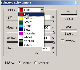 Then there are the options that use Adjustment Layers. You either choose Layer> New Adjusment Layer> Selective Color... or you use the layer palette. On the bottom, press the button for Adjustment
